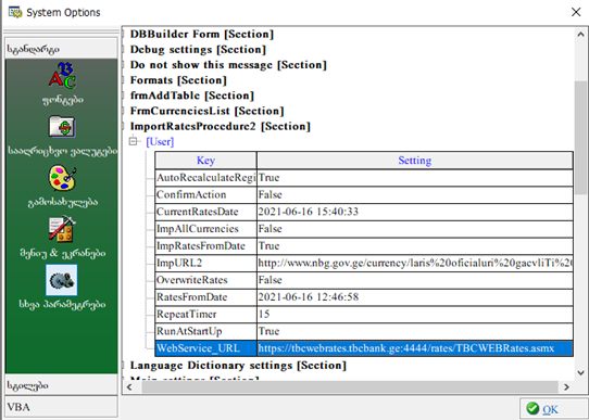 https://tbcwebrates.tbcbank.ge:4444/rates/TBCWEBRates.asmx and click the OK button. Exchange rates will be imported after you reboot the system.