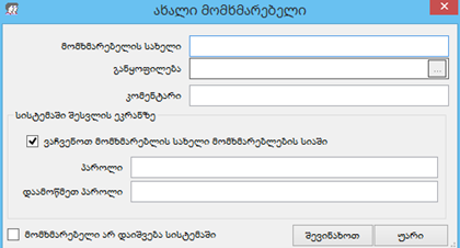 შეავსეთ ველი „მომხმარებლის სახელი“, ველის „განყოფილება “ გასწვრივ მდებარე ღილაკზე დაწკაპებით გადით განყოფილებების სიაზე . აირჩიეთ თქვენთვის სასურველი განყოფილება(სიაში თუ არ არის განყოფილება შეგიძლიათ დაამატოთ),ველში „კომენტარი“ შეიტანეთ თქვენთვის სასურველი ინფორმაცია ( არ არის სავალდებულო) . მოსანიშნი „ვაჩვენოთ მომხმარებლის სახელი მომხმარებლების სიაში“ უნდა იყოს მონიშნული თუ გსურთ ,რომ სისტემაში შესვლისას ჩამონათვალში გამოჩნდეს ახალი მომხმარებელი. (თუ არ იქნება მოსანიშნი მონიშნული ,მაშინ მომხმარებლების სიაში არ გამოჩნდება თქვენს მიერ დამატებული მომხმარებელი. ასეთ შემთხვევაში სისტემაში შესვლისას მომხმარებლის სახელი უნდა აკრიფოთ ხელით ). ველში „პაროლი“ შეიყვანეთ პაროლი ,ველში „დაამოწმეთ პაროლი “ გაიმეორეთ იგივე პაროლი. თუ გსურთ რომ კონკრეტული მომხმარებელი ვერ შევიდეს სისტემაში ,მაშინ მონიშნეთ მოსანიშნი „მომხმარებელი არ დაიშვება სისტემაში “.დააწკაპეთ ღილაკს „შევინახოთ“ ახალი მომხმარებელი დაემატება მომხმარებლების სიას.