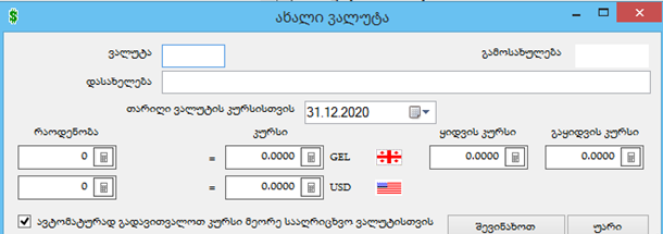 • პასუხი: ჩამოტვირთეთ წინა პერიოდის დოლარის კურსები და შემდეგ მაკრო ოპერაციებიდან გაუშვით ოპერაცია: “ვალუტის კურსის გასწორება და ექვივალენტური სიდიდეების გადათვლა“.