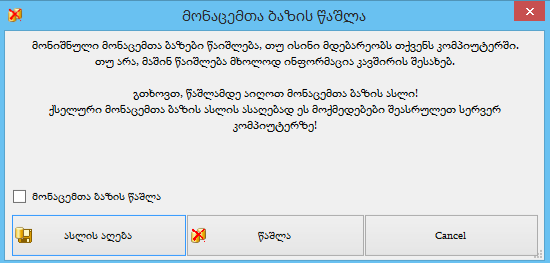 თუ მონაცემთა ბაზის წაშლა გსურთ მხოლოდ მონაცემთა ბაზების ჩამონათვალიდან დააჭირეთ ღილაკს „წაშლა“ .მონაცემთა ბაზის წაშლა თუ გსურთ SQL სერვერის მონაცემთა ბაზებიდანაც მონიშნეთ მოსანიშნი „მონაცემთა ბაზის წაშლა “ და ამის შემდეგ დააჭირეთ ღილაკს „წაშლა“ .