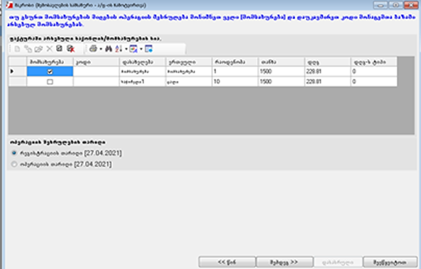 • 2.2.6 ოპერაციის დამატებისას გამოდის შეტყობინება ოპერაციის თარიღი უნდა აღემატებოდეს სასტარტო თარიღს.