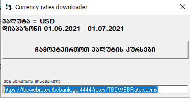 https://tbcwebrates.tbcbank.ge:4444/rates/TBCWEBRates.asmx და დააჭირეთ ღილაკს OK. პროგრამაში თავიდან შესვლის შემდეგ მიიმპორტდება კურსები.